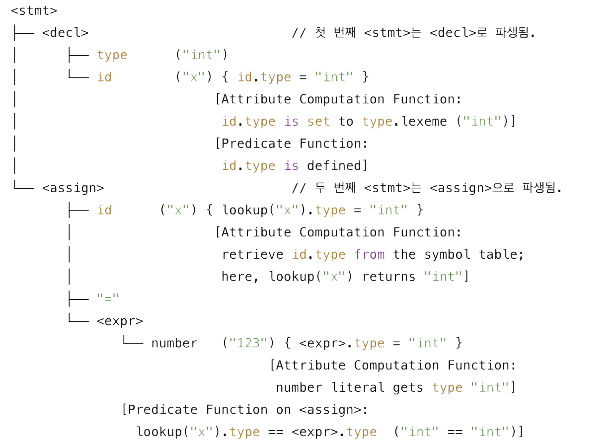 Attribute Grammar란 속성(Attribute, 의미적 정보)를 구문 트리의 각 노드에 부여하고, 그 속성값을 계산하는 방법이다.