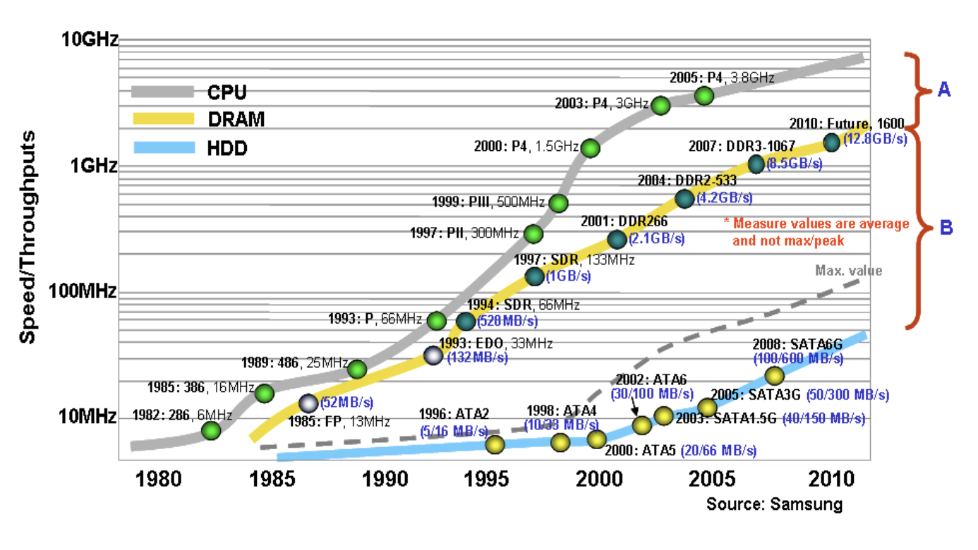 A > B 이다 (로그 스케일임), CPU 입장에서는 DRAM 속도도 너무 느림.