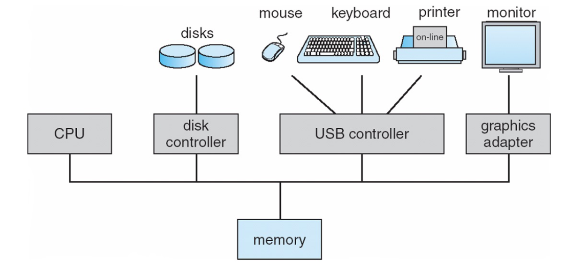 • CPU, Main Memory, I/O Device Controllers가 공통 Bus를 통해 연결되어 있음