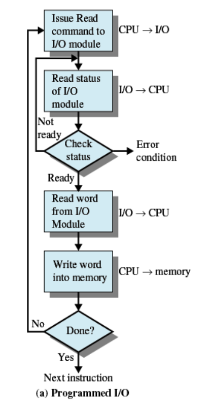 CPU가 I/O 장치 상태를 Polling(직접 계속 검사) 하면서 데이터 전송