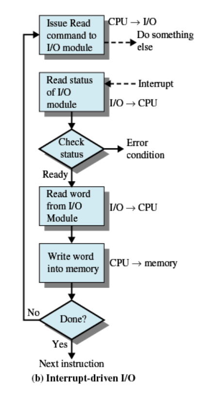 I/O 장치가 준비되면 CPU에게 Interrupt를 발생시키고 CPU는 처리 루틴 실행